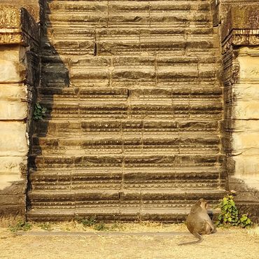 Ancient temple ruins under a partly cloudy sky with palm trees around.